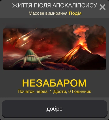 Життя після апокаліпсису — це обмежена за часом подія, яка головним чином зосереджується на масових вимираннях. Подібно до технологічного дерева життя, у цьому є генератори, які щосекунди виробляють основну валюту види. Проте, на відміну від інших симуляцій, значок валюти змінюється залежно від прогресу гравця в події.