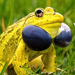 Bullfrog | Named for the mooing of a cow, bullfrogs employ their distinctive croaks during mating season. The male Indian Bullfrog overpreforms by also temporarily turning his vocal sacks blue and his skin yellow. | 2.16 E103 | 25% | Frog |