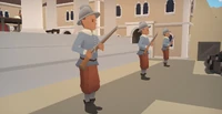 Musket | In the early 16th century, Europeans use muzzle-loaded long guns to pierce armored suits—soon to be obsolete. The slow load time is mitigated by soldiers firing in orchestrated volleys with greater accuracy and range. | Age of Exploration | Row of Musketeer on seaside in front of the bank building | ||