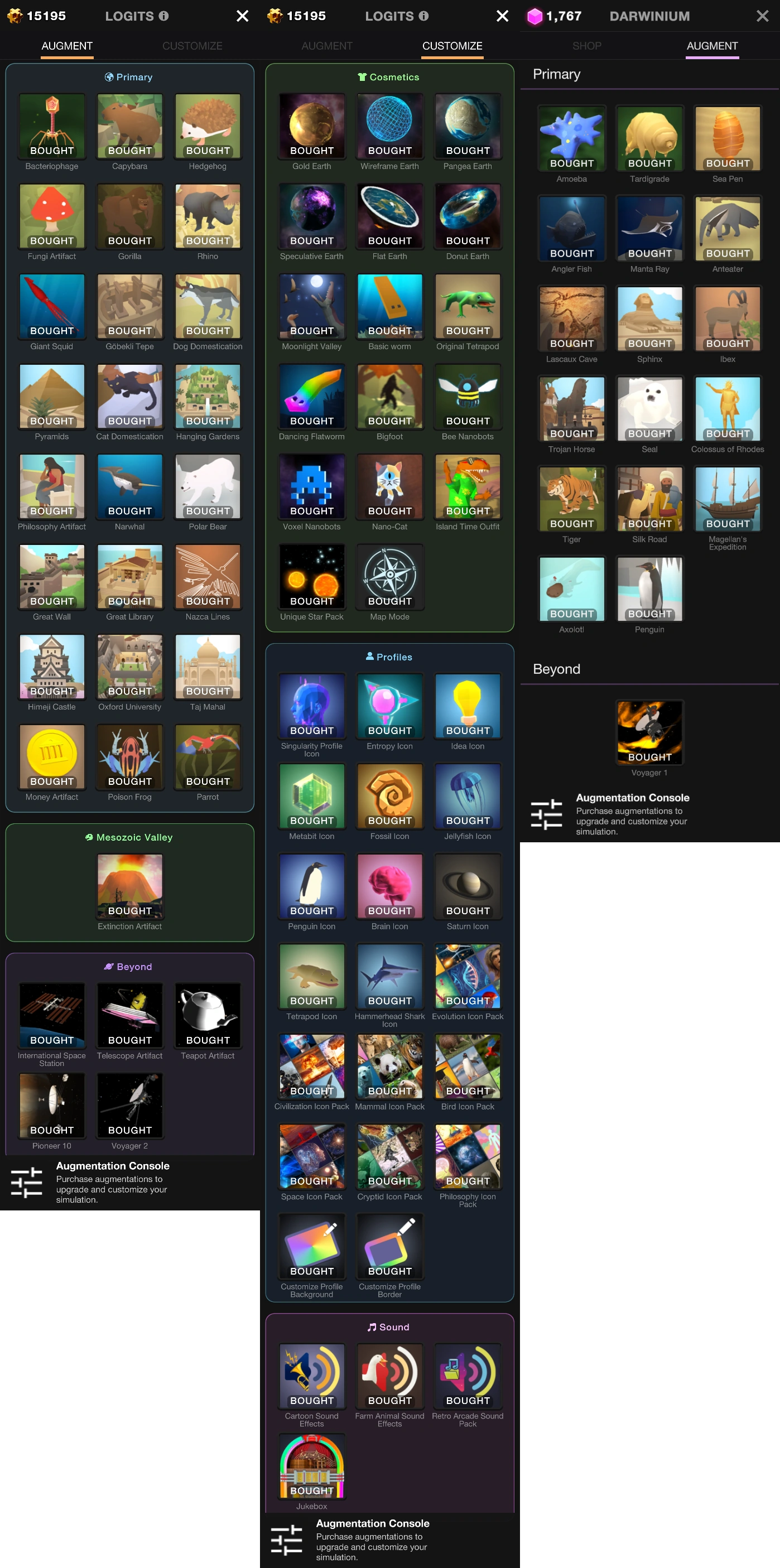 The Augmentations Console, formerly the Logit Console, is a store which sells several 'Augmentations'. Players can use Logits and Darwinium in order to buy Artifacts and cosmetic upgrades. Logits can be obtained by completing Explorations' missions and reaching different rankings in Event Leaderboards.