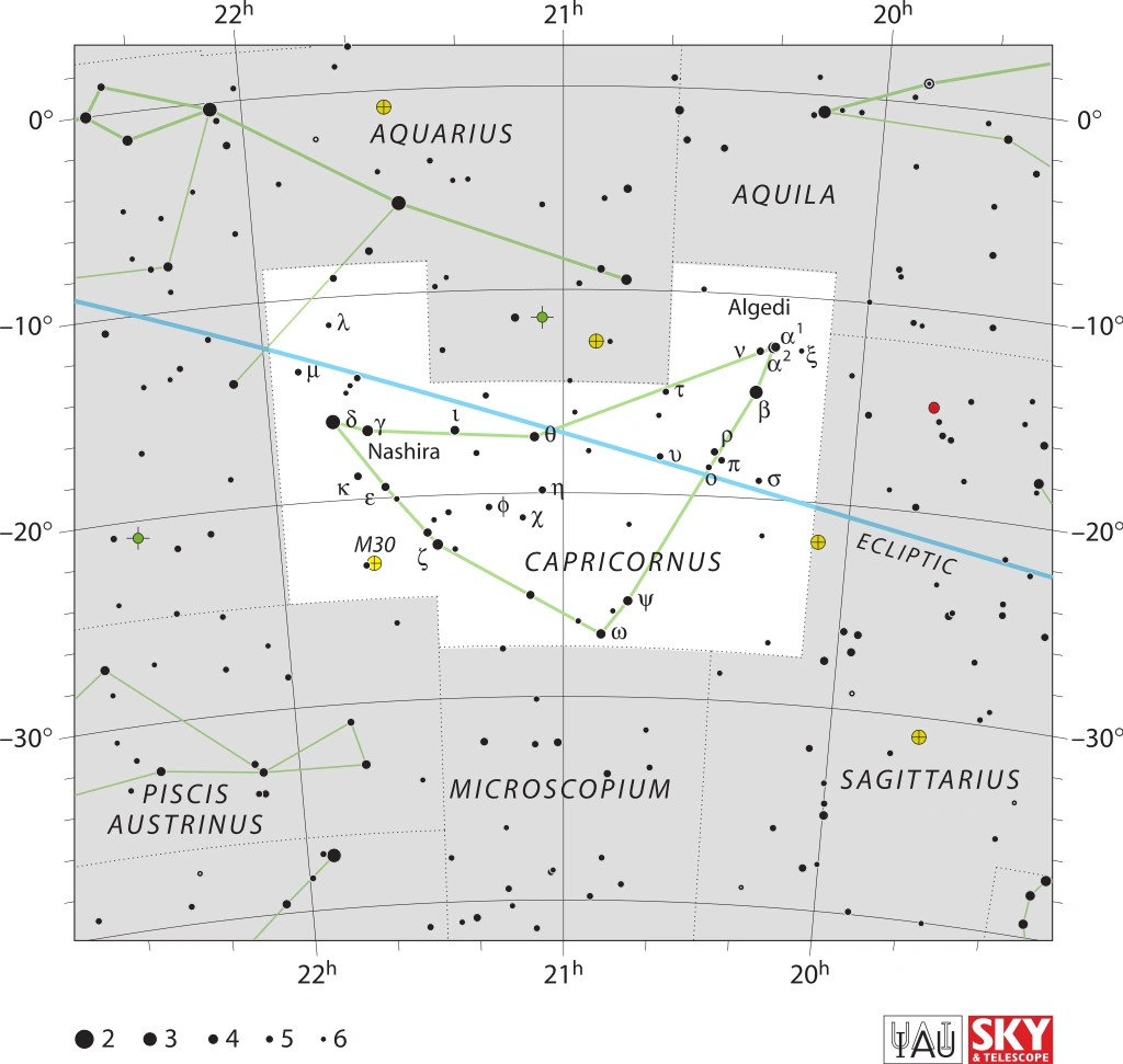 The constellation Capricorn is one of the twelve zodiacs in the night sky. It consists of ten main stars and a total of 29 Bayer designated stars. The stars that form the, as in-game shown, sea-goat are α2 Capricorni (Algedi), β1 Capricorni (Dabih), γ Capricorni (Nashira), δ Capricorni (Deneb Algedi), ζ Capricorni, θ Capricorni (Dorsum), ι Capricorni, ψ Capricorni, ω Capricorni and 24 Capricorni.