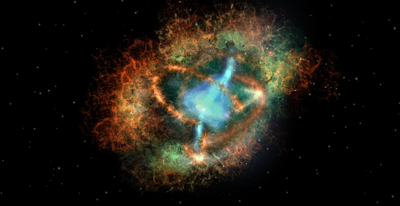 The Crab’s original star was a hefty 10 solar masses, but only 1% of the cloudy matter remains. It’s unusually rich in heavy metals—iron, nickel, and others that once formed the core. Swiftly moving filaments of ionized gas spread the metals throughout the nebula.
