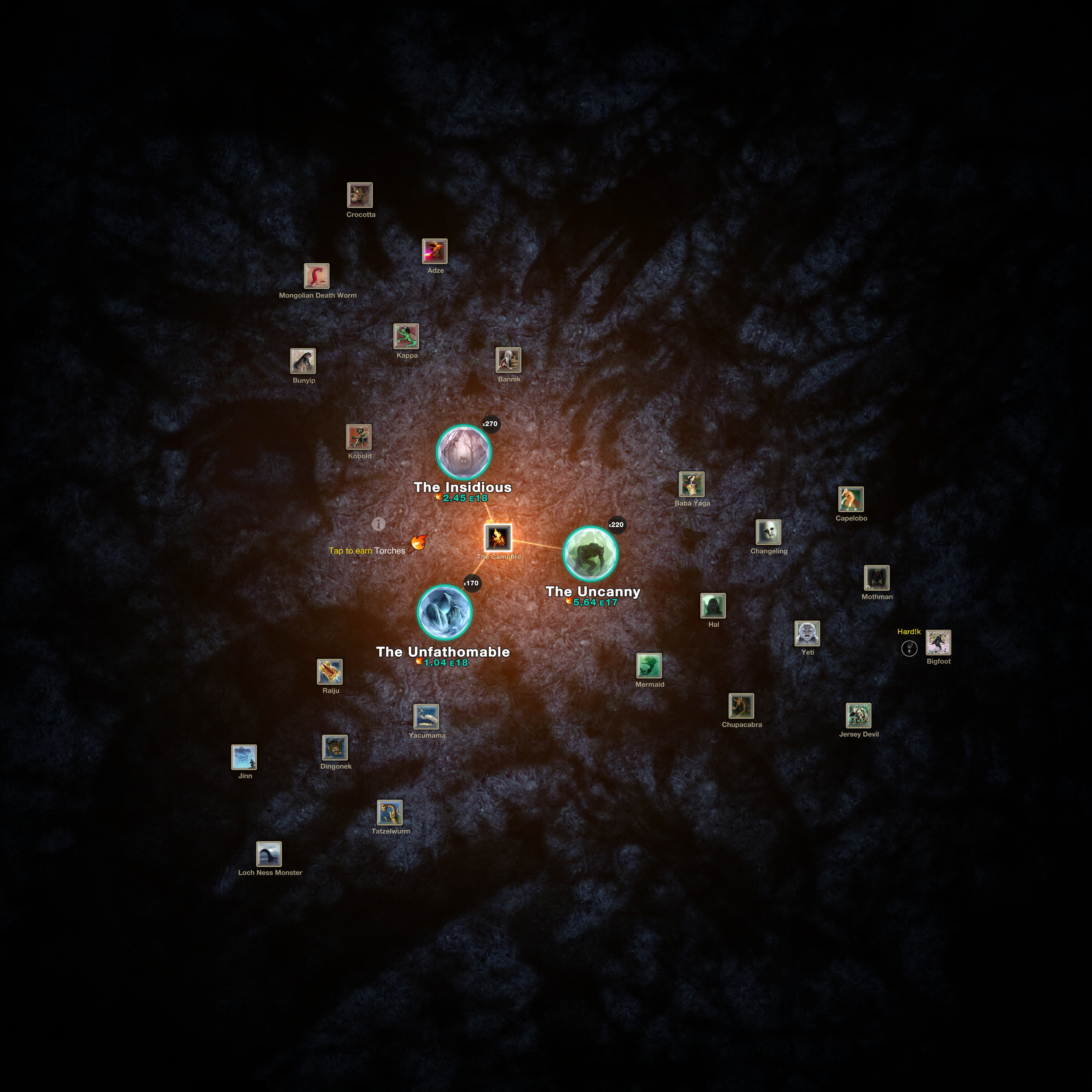 The Unfathomable | Massive beasts are imagined to stretch across the sky or roil beneath the oceans. These beings are often protectors of the natural world and are used to explain the cataclysmic damage caused by nature. | 5e7 | 2,500/s | The Campfire Hal |