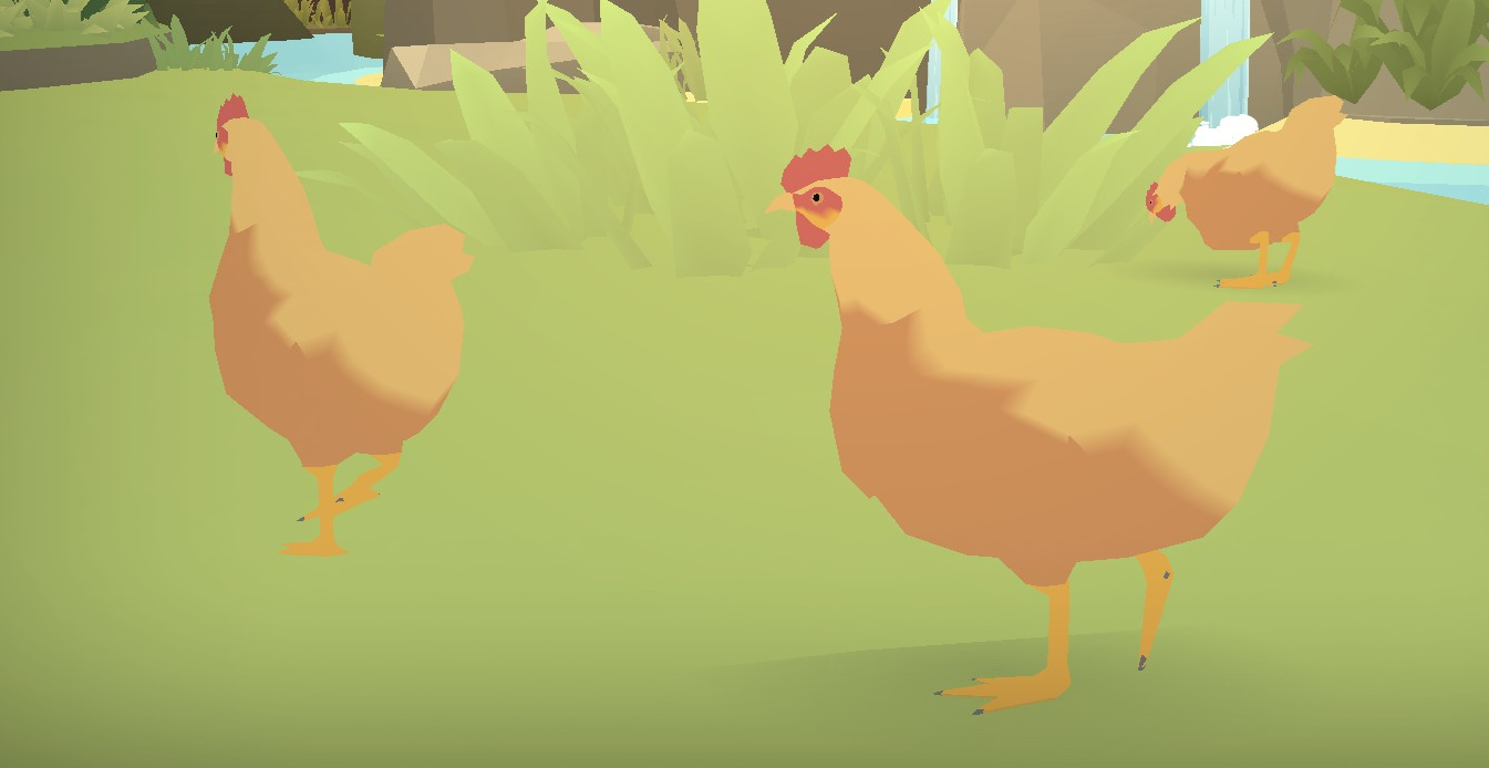 Galliformes takes on the appearance of a rooster, a male chicken (Gallus gallus domesticus). Three roosters cluck around in the Plains section of the Land garden, some of them feeding on grains on the ground.