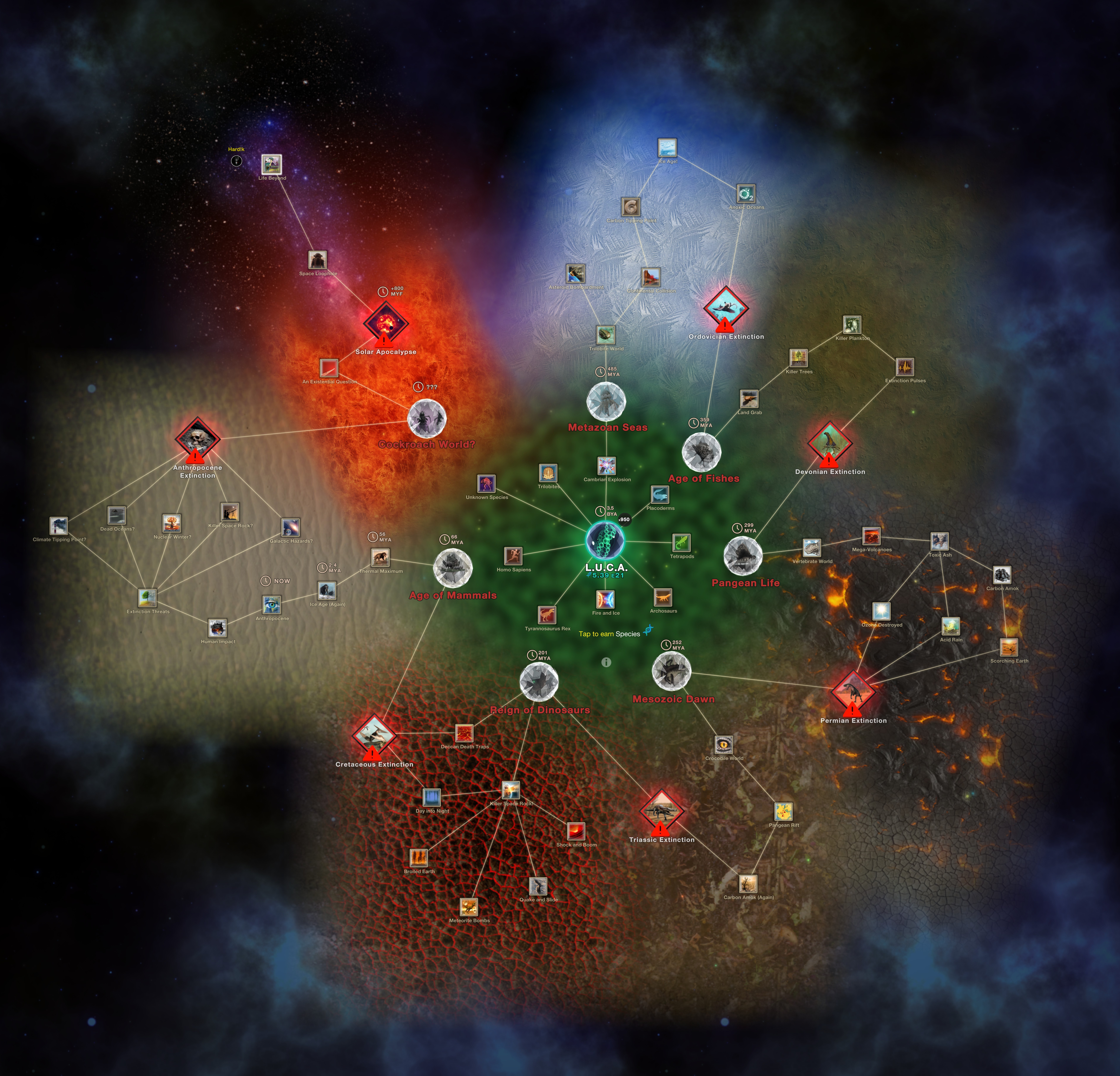 Life After Apocalypse is a limited time event which mainly focuses on Mass Extinctions. Like the Tech Tree of Life, this one features generators that produce its main currency per second, Species. This is also the first event which the currency's icon changes depending on the player's progress In the event. (DNA Helix, Trilobite, Placoderm, Tetrapod, Archosaur, T. Rex, Homo Sapiens, Cockroach)