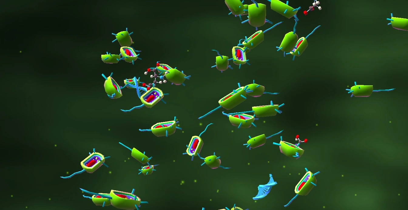 This generator is modeled after a prokaryotic cell cut open to reveal its organelles. There are capsules, flagella, nucleoids, cytoplasm, pili, and cell membranes and walls. They belong in the Primordial Soup habitat, and bounce around an invisible sphere wall. Clicking on the Prokaryotic Cell prompts a bubbly selecting sound.