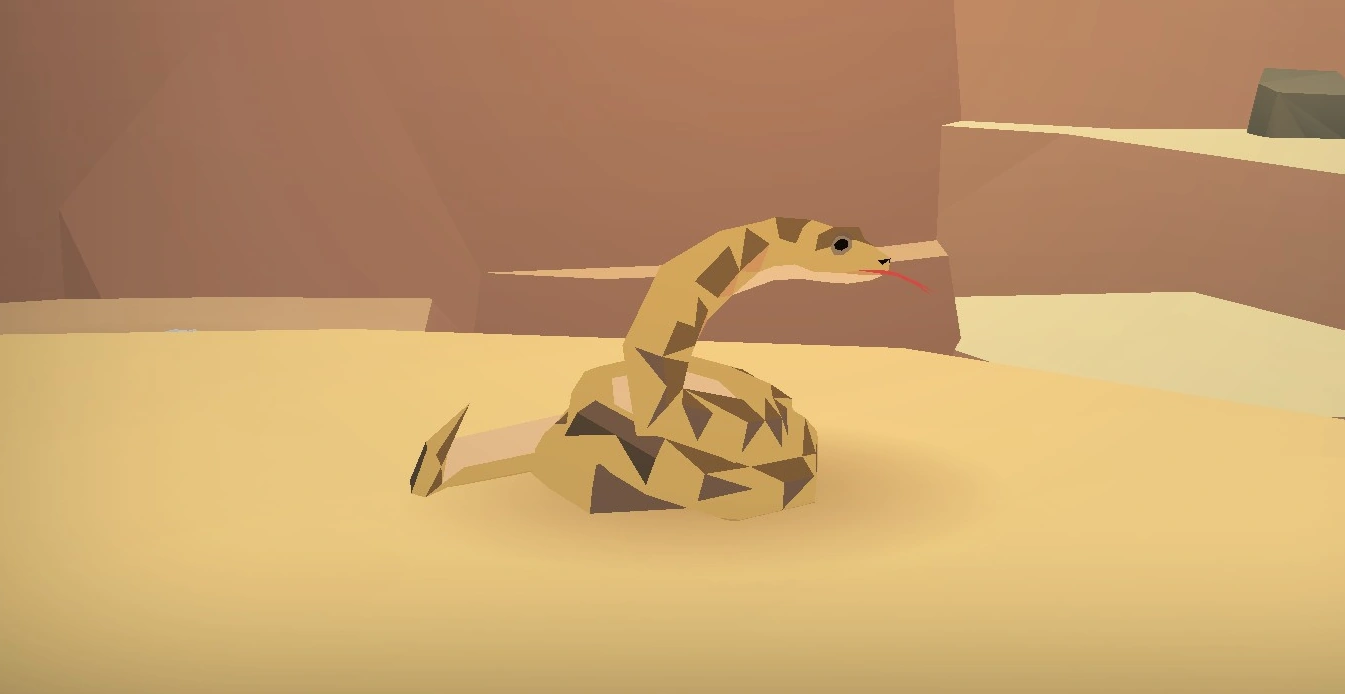 The snake has the appearance of a timber rattlesnake (Crotalus horridus). Two snakes resides in the Desert section of the Land garden. One is behind the elephant (Ungulates) and Archie's Fossil, and another before an ibex (Ungulates). The snake remains coiled and moves its head and tongue around.