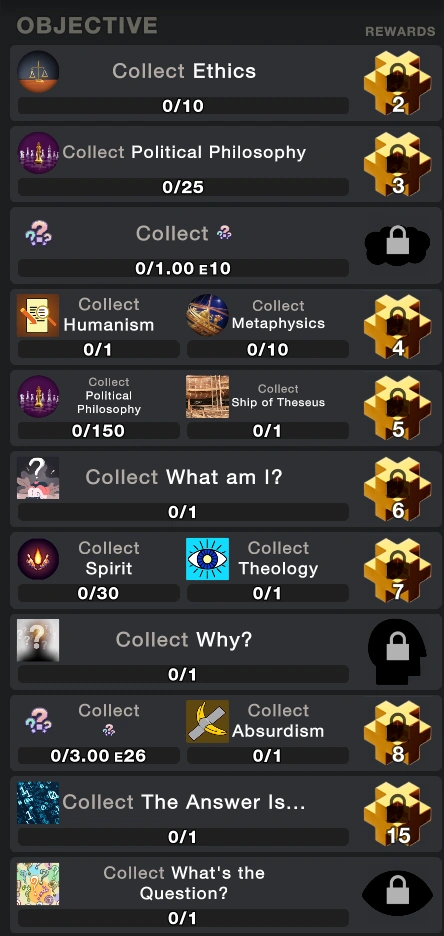 This exploration holds some rewards already mentioned above. The main ones being these three badges: Bronze: Confusion, Silver: Open-Mindedness and Gold: Enlightenment which have an effect on all other evolutionary branches, speeding up every simulation by 1%, and also speeding up production in future The Big Questions simulations by 5, 10 and 15% respectively.